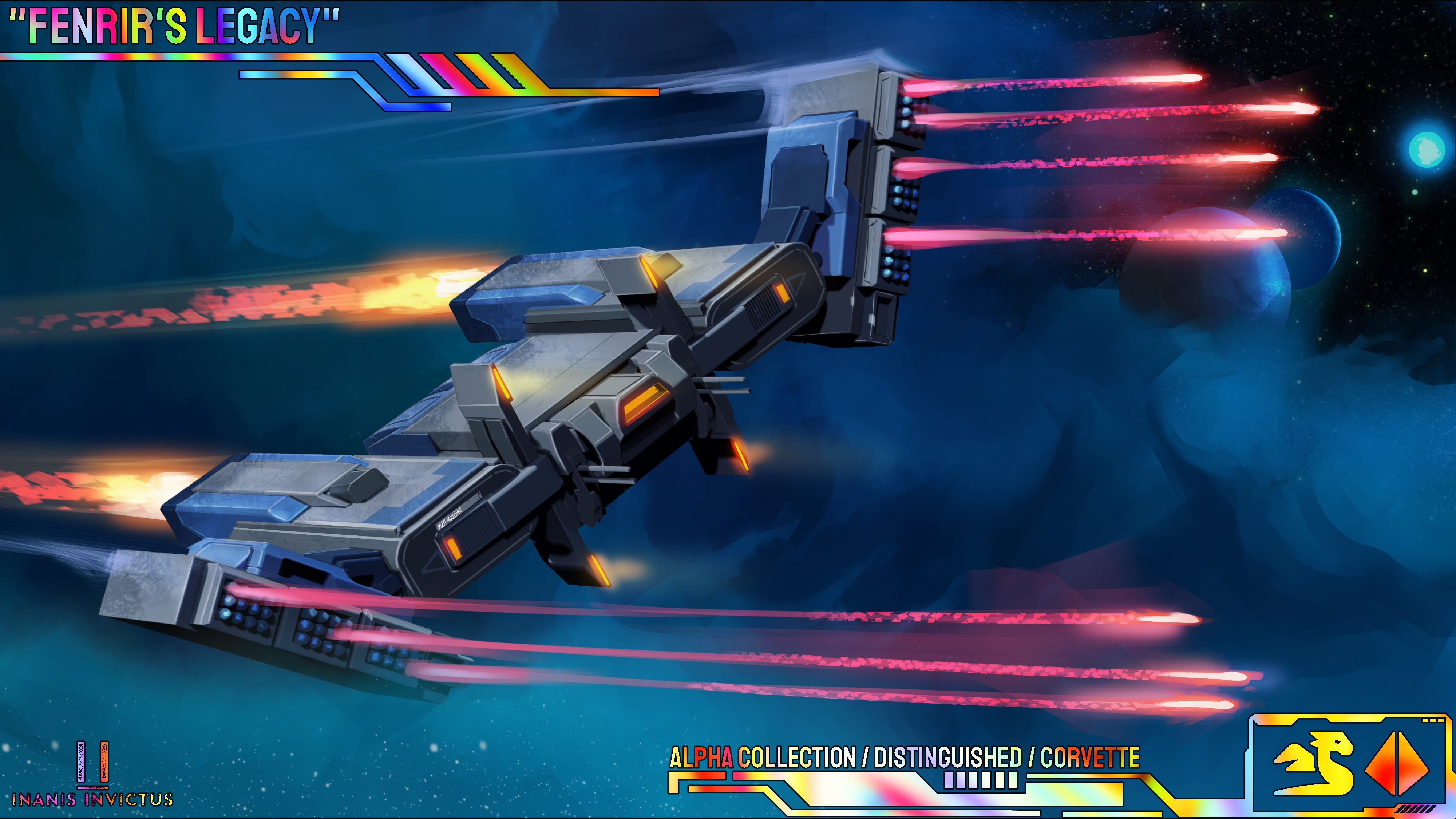 Fenrir's Legacy is the elusive flagship of a powerful smuggler and pirate organization known as Hel's Clutch. The ship has eluded capture or destruction for well over a decade as the group's power, wealth and authority have swelled. Rumored to once have been part of a black ops Terran organization that once served the highest tiers of Terran government, the group is now most known for dominating and controlling a stretch of rim worlds near the Kalyx-B, the famous red light district world known for its high-profile gambling and gaming, wide range of drugs and all manner of illicit entertainments. Fenrir's Legacy is a modified and expanded version of the smaller 'Skeggox' corvette class torpedo ships that replaces the Jormundagr-L torpedo systems with the deadly 'Skofnung' assault missile arrays. Fenrir's legacy, with superb speed, phased shields and an evasive control system, is perfectly suited for swift hit and run missions and more than capable of surviving even the most robust counter attacks.
