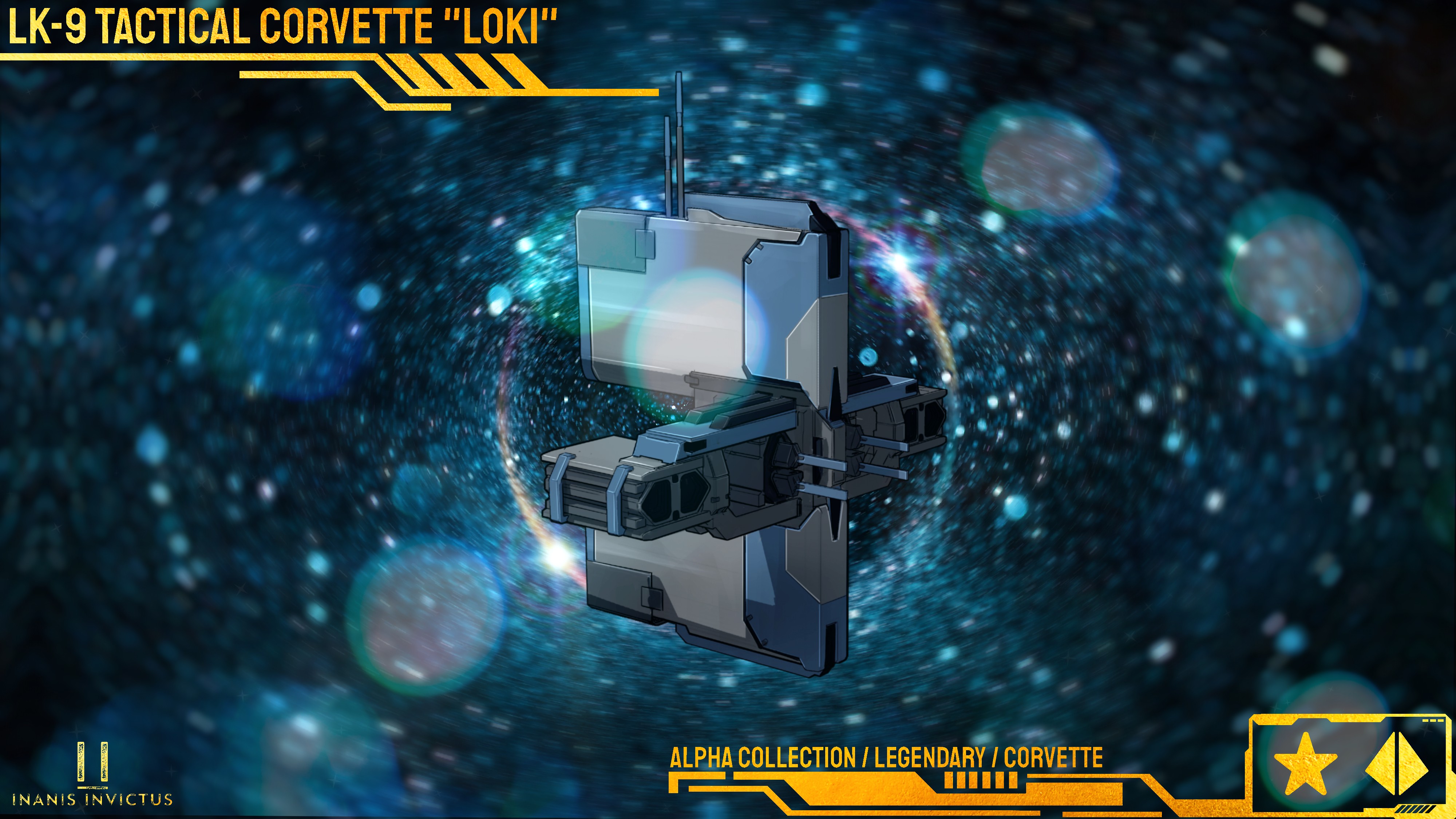 The LK-9 Tactical Corvette, codenamed 'Loki', by Odin Industries is designed as an advanced reconnaissance and special operations platform capable of fleet command and control and interference operations. The Loki Tactical Corvette boasts superb speed and maneuverability and an advanced electronics and quantum sensors array giving it a significant tactical advantage over ships without. Modestly armed with a pair of the Odin RX-R 80mm rotary cannons and lightly armored, the Loki is most dangerous when deployed with armed escorts. The Loki was famously piloted by commander Terrance Hawkins in the battle at the Nebula Station Archaix-6 where his ship successfully turned the station’s defenses against themselves, effectively ending the battle before it started.