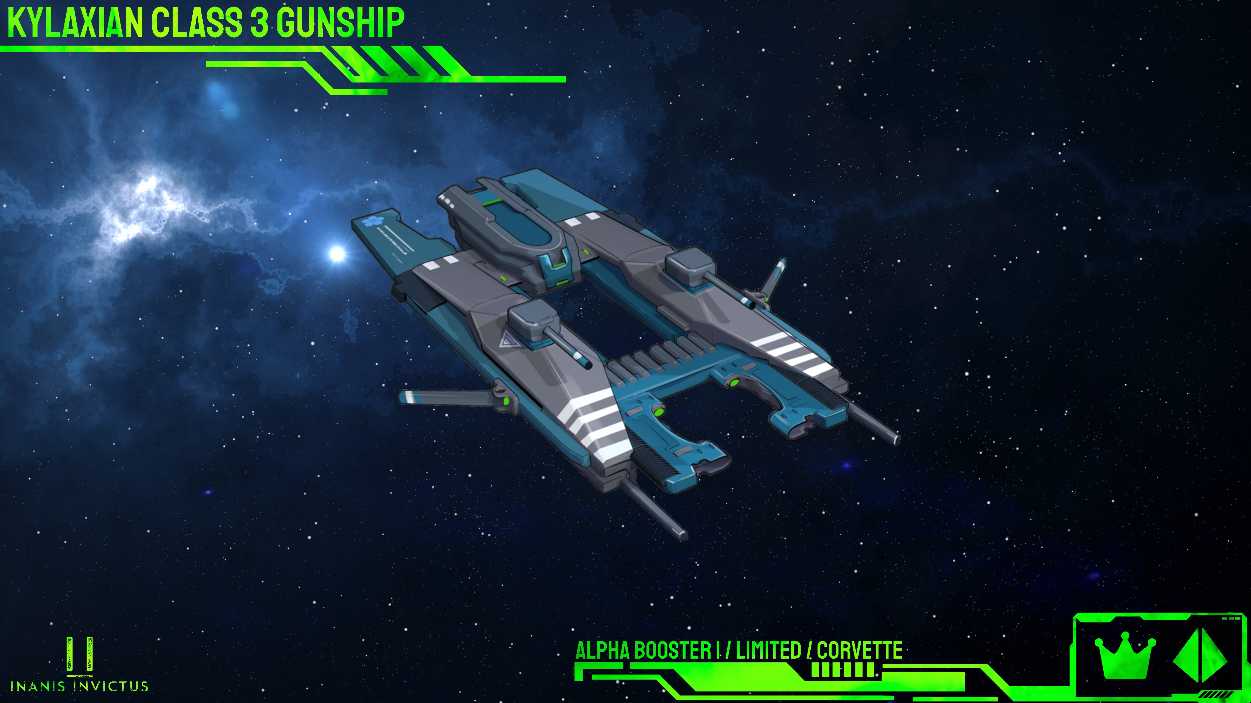 Trade guild convoys are and continue to be, prime targets for pirate scum looking to make a quick cred. The trade guilds usually employ guards, but that has often proven to be expensive and ineffective. Seeing an opportunity to not only protect its own interests, but to also increase their own profits, the Kylaxian Trade Guild began designing and manufacturing their own ship designs to combat pirate and raider threats throughout the galaxy. Designed as a heavy support and escort corvette, the class 3 gunship was purpose built to support a lightly armed trade convoy against a wide range of threats while providing the capability and resources to repair and maintain convoys through the long journeys between isolated star systems. Boasting an advanced targeting control array, along with a pair of ROF-X2 gauss cannons, the class 3 gunship can acquire and coordinate firing solutions using fleet wide targeting data with devastating effect.