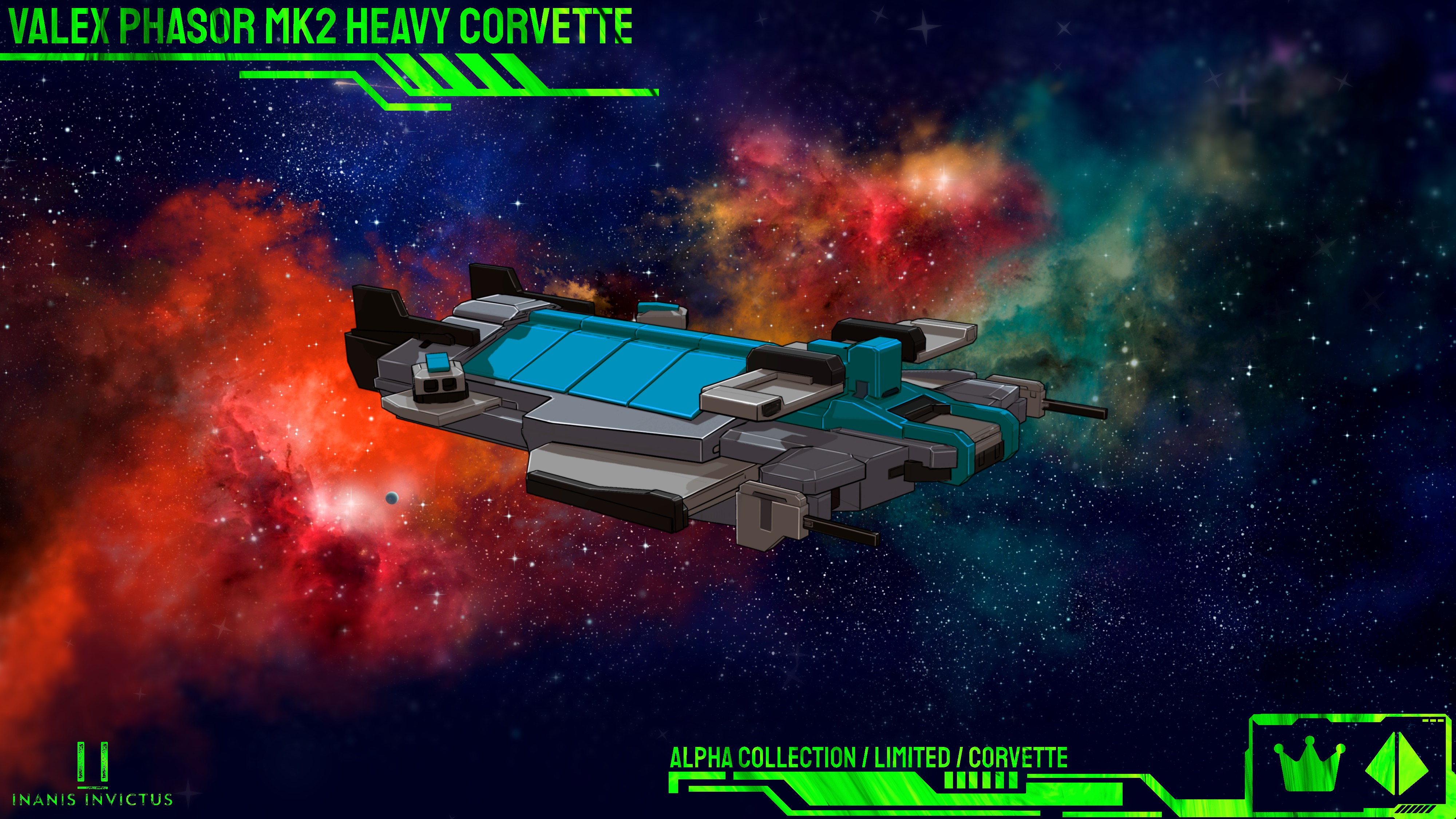The Phasor Mk 2 heavy corvette by the Valex Conglomerate was the answer to the Kathika Imperium's expanded use of fighter and bomber aircraft in the Juniper campaign. Designed primarily as an anti-aircraft and support platform the Phasor exceeded most performance predictions in every live test case. Armed with a 'Phase Cutter' particle beam system and a pair of Lightstorm Mk 1 PD phaser turrets, the Phasor can effectively engage simultaneously targets with ease. The Phasor comes equipped with a phased shield array, advanced targeting AI and best in class shields and armor, giving it a superior combat rating.