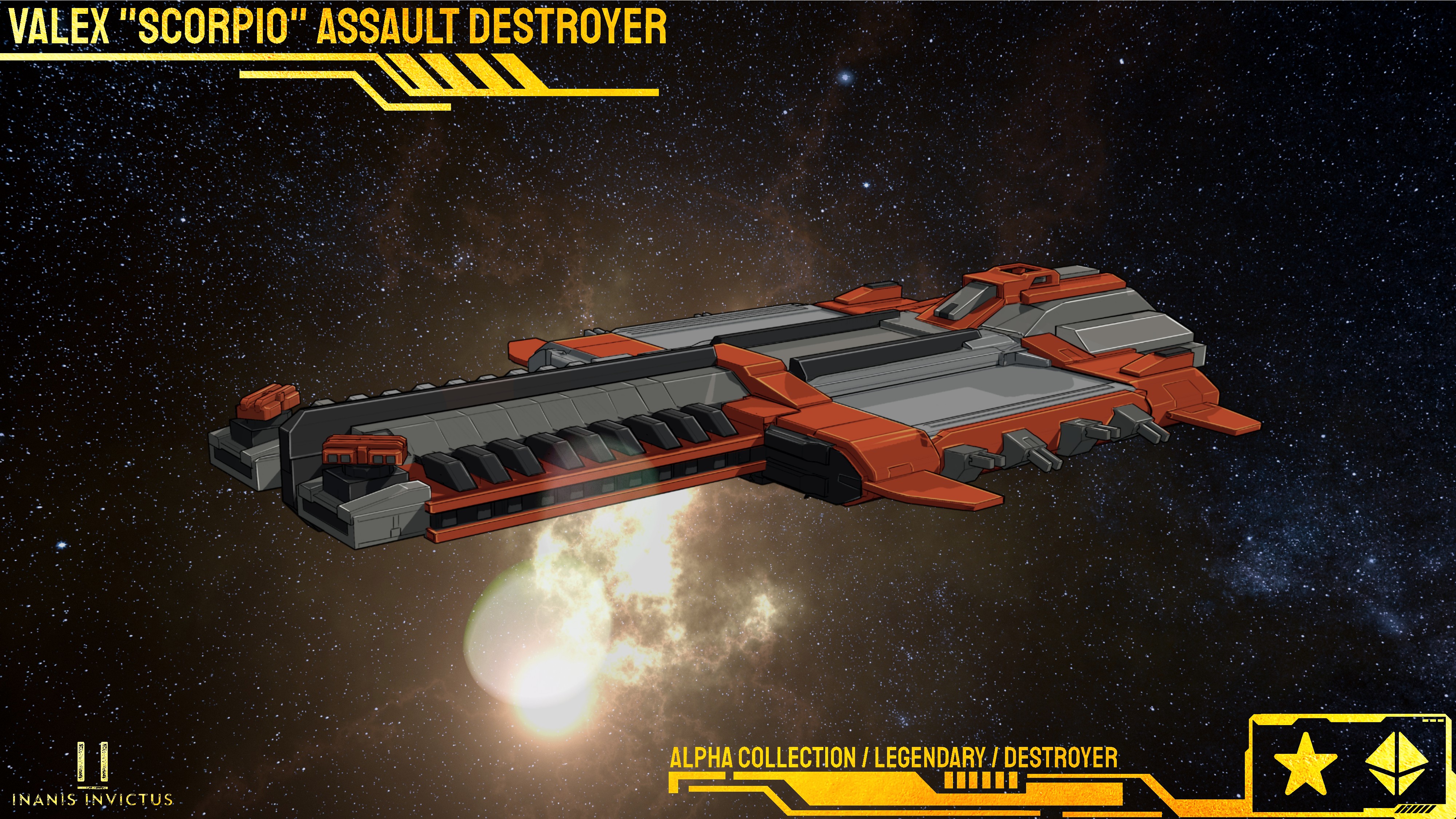 The Scorpio Assault Destroyer was the direct response to the Imperium's introduction of the 'Griffin' assault destroyers and, in proper Valex form, combines an impressive amount of firepower with an incredible survivability. Originally prototyped as a long-range interdictor, the Scorpio was hastily updated when a fleet of unknown, at the time, Imperium heavy destroyers overran the Centuari-4 system that were reportedly impervious to most small craft weapons at the time. The Valex Conglomerate won the contract bid from several Terran governments and built numerous Scorpio destroyers in record time.