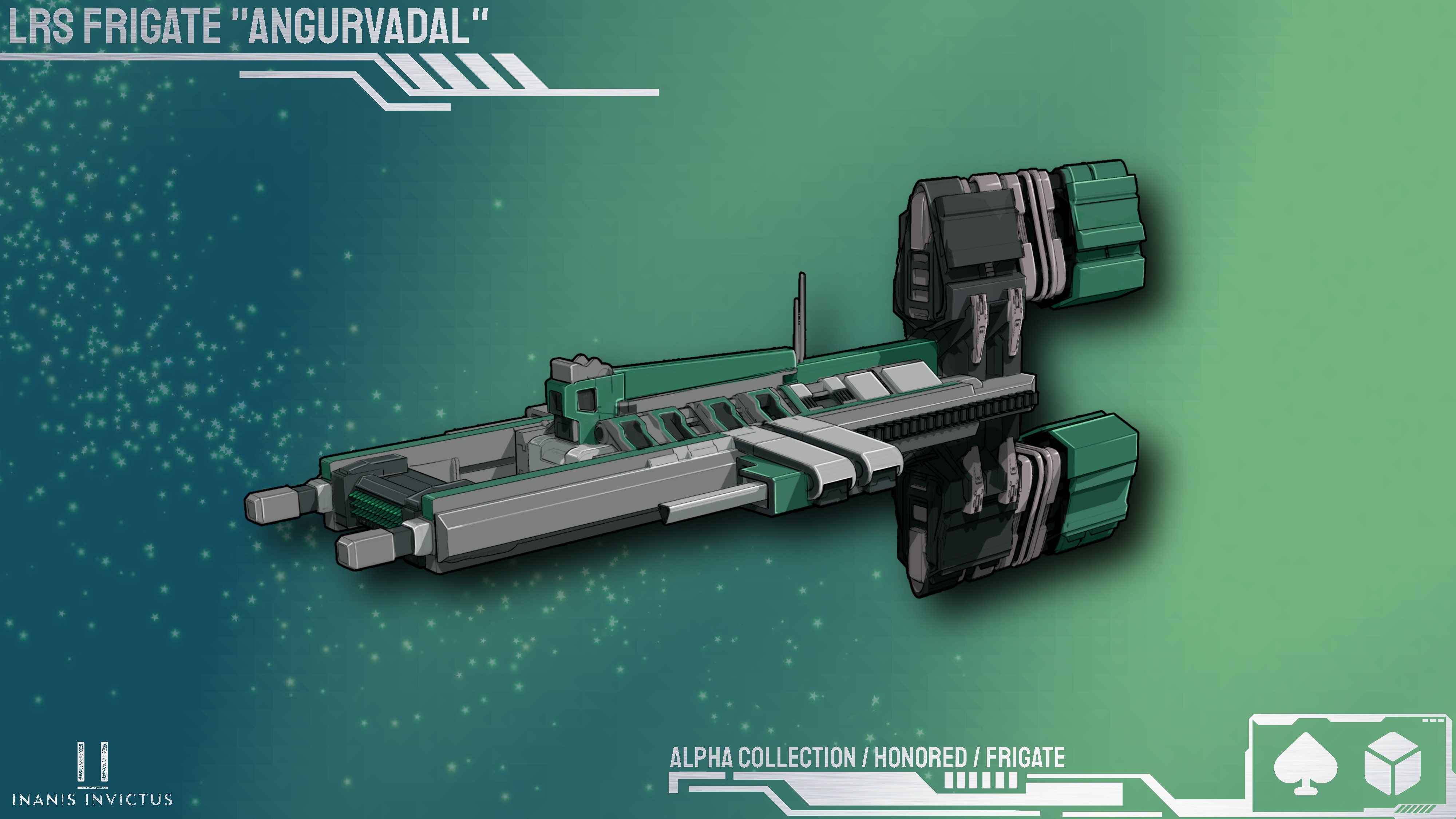 Leveraging the large command ships engineered and deployed by both the Valex Conglomerate and Odin Industries, Terran fleet commanders sought a long-range support ship capable of engaging targets from a longer distance. The Angurvadal long range support ship was Odin's answer to the call. Leveraging a pair of long range Atgeir 80mm spinal mounted rail guns with an onboard targeting AI and a light guided missile array, the Angurvadal is the perfect solution for the proposed problem.