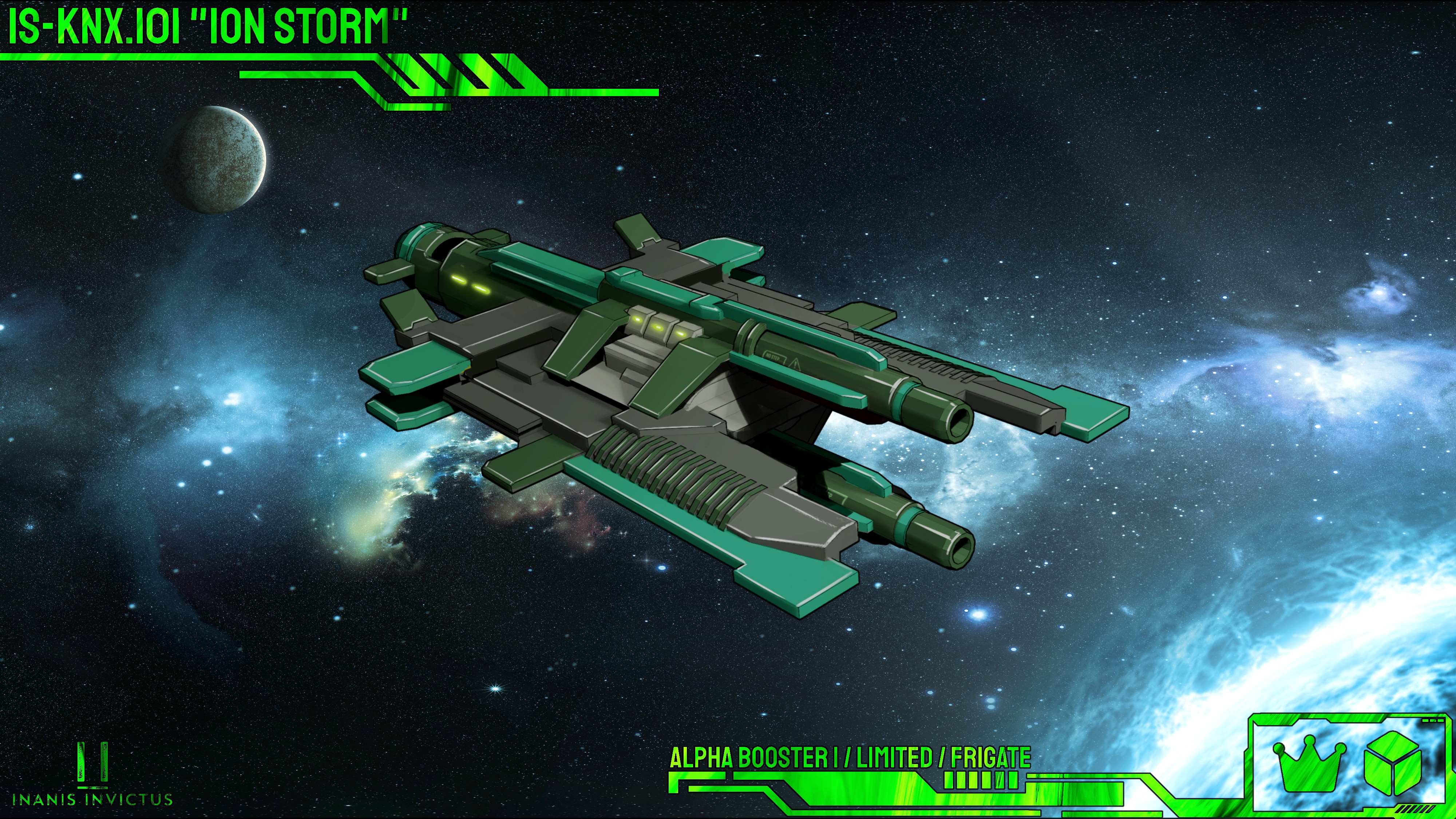 When the Imperium's heavy battle cruisers and carriers began threatening densely populated systems and supply lines, Valex quickly designed and deployed the IS-KNX.101 as a rapidly deployable anti-capital ship solution. More like a mobile weapon's platform, the Ion Storm frigate is built around 2 extremely powerful INX class Fused Ion Cannon arrays. While generally more lightly armored and and shielded then its class counterparts, the 'Ion Storm' frigate has proven, time after time, to be a terrifyingly effective weapon when deployed and supported by knowledgeable fleet commanders. With each cannon requiring its own class 3 fusion reactor, it's a wonder that the Valex engineers made this platform work at all!